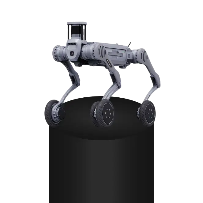 Unitree B2-W är utrustad med både ben och däck, vilket gör den kapabel att navigera effektivt på gräs, grus, sten och till och med trappor och sluttningar. Den klarar av ett brett spektrum av terränger och hinder, vilket gör den idealisk för både inomhus- och utomhusbruk.
